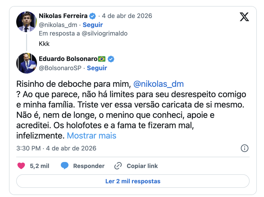 O ex-deputado Eduardo Bolsonaro (PL), filho do ex-presidente Jair Bolsonaro (PL), discutiu publicamente com o deputado federal Nikolas Ferreira (PL-MG) na tarde deste sábado (4/4), depois de uma publicação do parlamentar no X (antigo Twitter).
